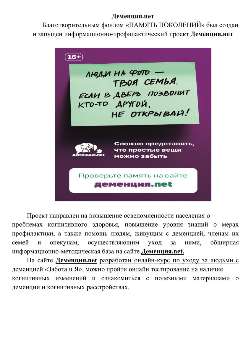 проблемах когнитивного здоровья, повышение уровня знаний о мерах профилактики, а также помощь людям, живущим с деменцией, членам их семей и опекунам, осуществляющим уход за ними, обширная информационно-методическая база на сайте Деменция.net.